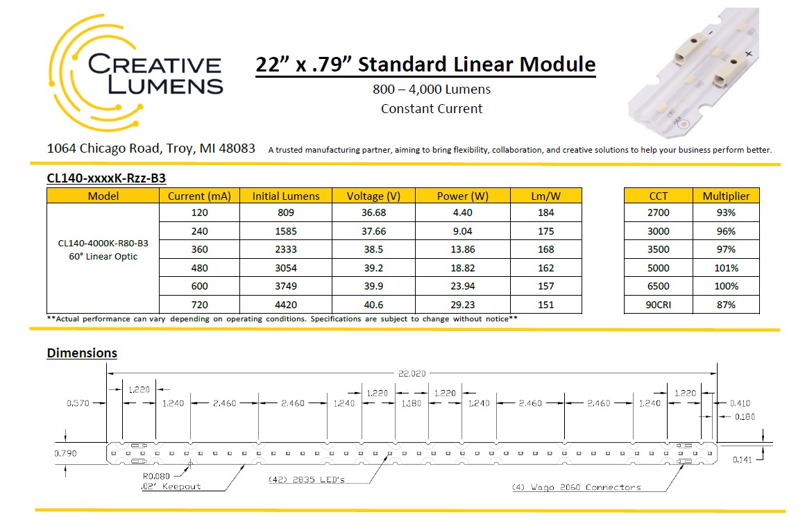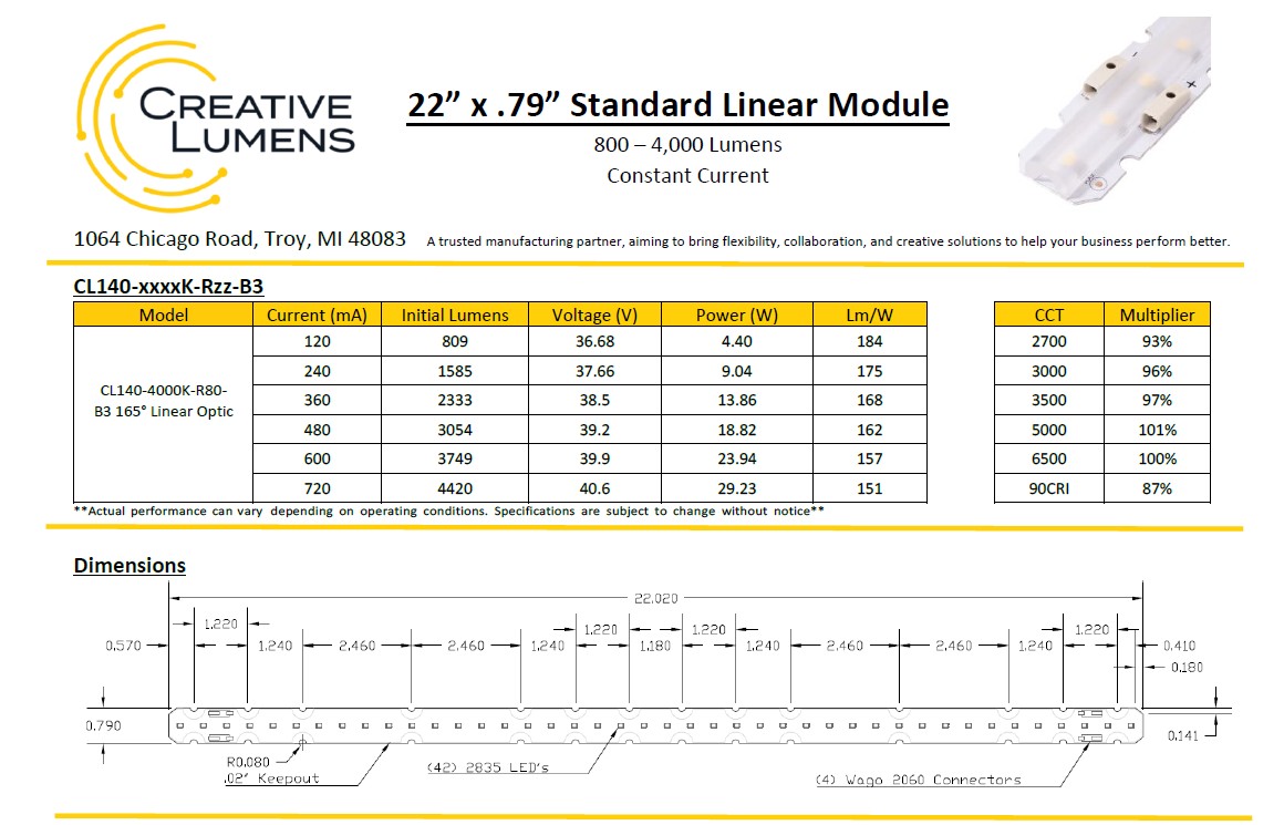 Creative Lumens can develop linear optics that can be provided as an option on many of our catalog products. The datasheets provided here are examples of two options presently provided and available on 32 LED, 42 LED, 64 LED, 96 LED boards and more.